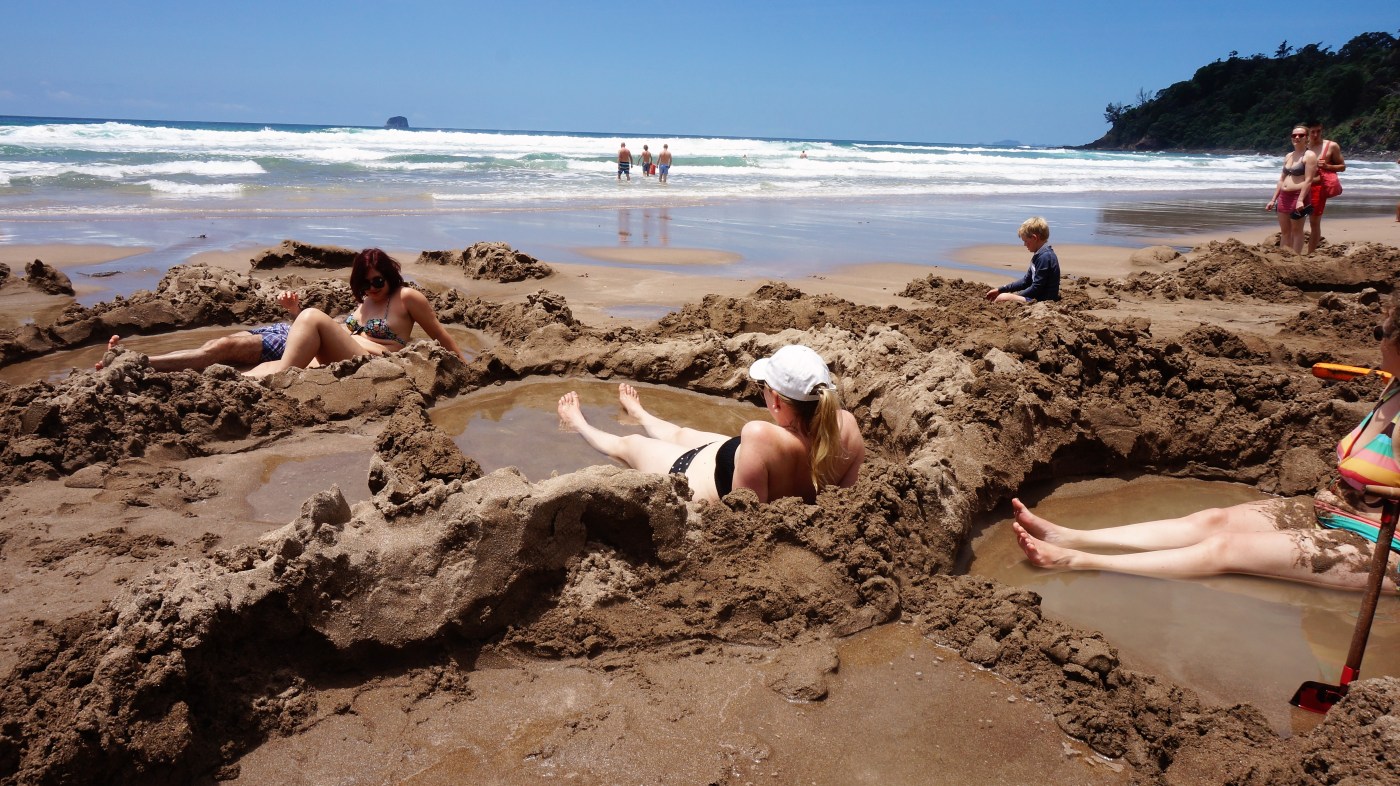 Hauptattraktion am Hot Water Beach sind wie der Name bereits vermuten lässt, die heißen Thermalquellen direkt am Strand. Am besten lassen sich diese bei Ebbe nutzen. Dafür benötigt man eine kleine Schaufel, welche sich am Campingplatz ausleihen lässt. Am Strand folgt man im Hauptzeitfenster (die Rezeption sagt einem übrigens, wann genau die Ebbe ist, ansonsten hilft das Internet) der Menschenmenge, laut Stefan Loose sind es in der Hochsaison bis zu 500 Personen. Obwohl hier die Hochsaison bereits begonnen hat, waren es längst nicht so viele, wir schätzen max 100 Personen.