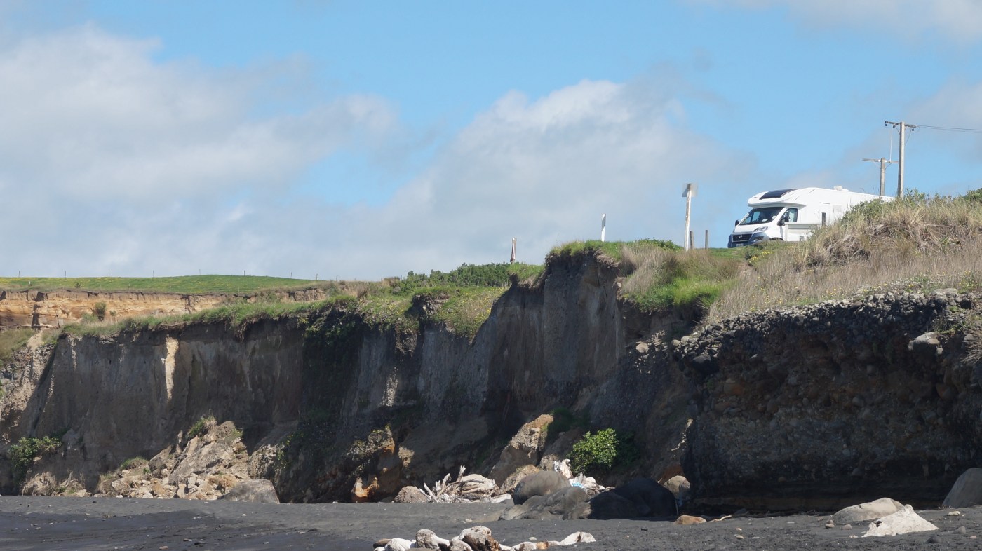 Von Whanganui sollte es für uns weiter entlang der Küste gehen, um dem nächsten Ziel Waitomo näher zu kommen. Wieder nutzten wir die Vorzüge des Campers, fuhren ganz früh los und machten an einem schönen menschenleeren Strand Halt, um zu frühstücken und Zeit am Wasser zu verbringen. Der Strand in Oware war sehr faszinierend, da die Felsvorsprünge an der Küste zu einem großen Teil auch aus Lehm zu bestehen schienen. So wurde Wasser aus den Wänden herausgepresst, das wiederum für einen tollen Farbfilm an der Oberfläche sorgte. Nicht ganz ungefährlich, da es bereits einige Erdrutsche gegeben haben musste. Schilder wiesen darauf hin, dass man Fahrzeuge nicht zu nah an den „Klippenrand“ abstellen sollte. Wir gönnten uns noch eine schöne Zeit, um das Wasser und die Sonne zu genießen und unser Kleiner, um einen ausgiebigen Vormittagsschlaf bei frischer Luft zu halten.